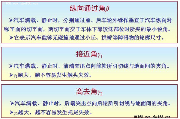 接近角、离去角和纵向通过角的大小是体现汽车通过性的重要几何参数。通过性(越野性)好的汽车,能以足够高的平均车速通过各种坏路和无路地带(如松软地面、凹凸不平的地面等)及各种障碍(如陡坡、侧坡、壕沟、台阶、灌木丛、水障等)。而通过性差的汽车,在面对坏路、无路地带和各种障碍时则会力不从心。