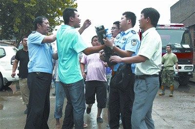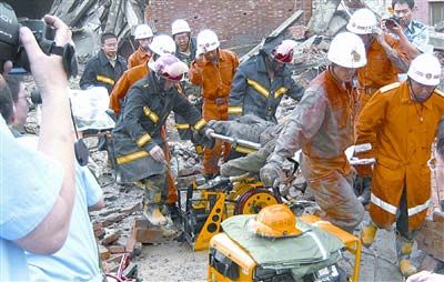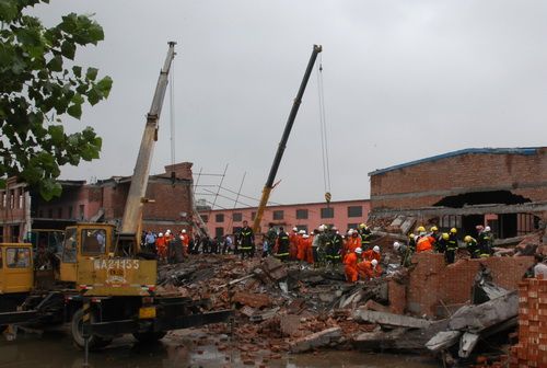 8月4日,消防队员和公安干警在厂房坍塌现场紧张救援 人民网记者 王明浩摄影报道