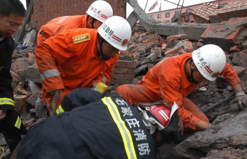 8月4日,消防队员在厂房坍塌现场紧张救援 人民网记者 王明浩摄影