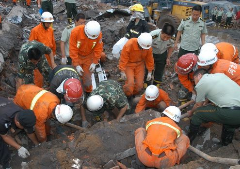 8月4日,消防队员和公安干警在厂房坍塌现场紧张救援 人民网记者 王明浩摄影报道